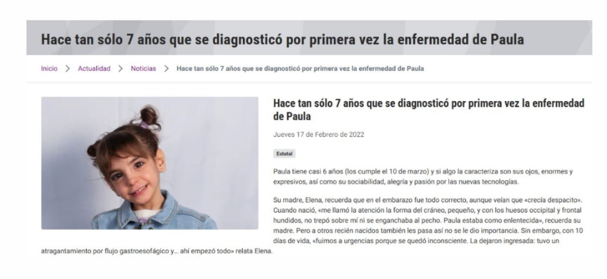 “Paula tiene casi 6 años y si algo la caracteriza son sus ojos, enormes y expresivos, así como su sociabilidad, alegría y «obsesión» por los smartphones. Su madre, Elena Matilla, recuerda que en el embarazo fue todo correcto, aunque veían que «crecía despacito». Cuando nació, «me llamó la atención la forma del cráneo, pequeño, y con los huesos occipital y frontal hundidos, no trepó sobre mí ni se enganchaba al pecho. Estaba como enlentecida», recuerda Elena.”