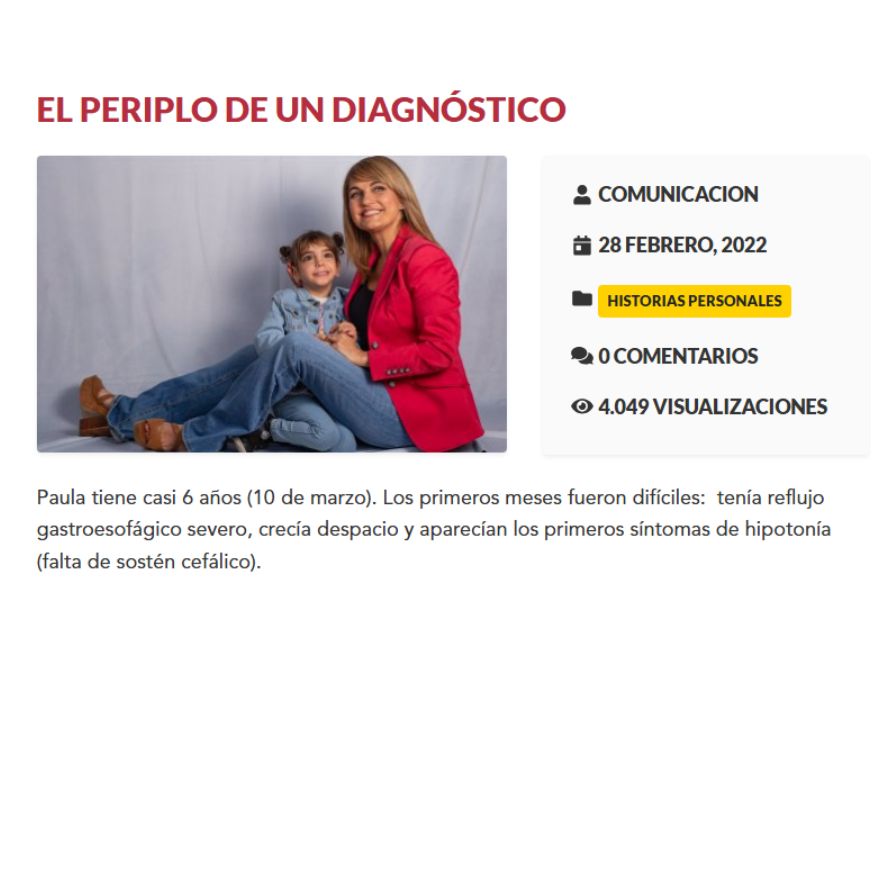 «Paula tiene casi 6 años (10 de marzo). Los primeros meses fueron difíciles: tenía reflujo gastroesofágico severo, crecía despacio y aparecían los primeros síntomas de hipotonía (falta de sostén cefálico).